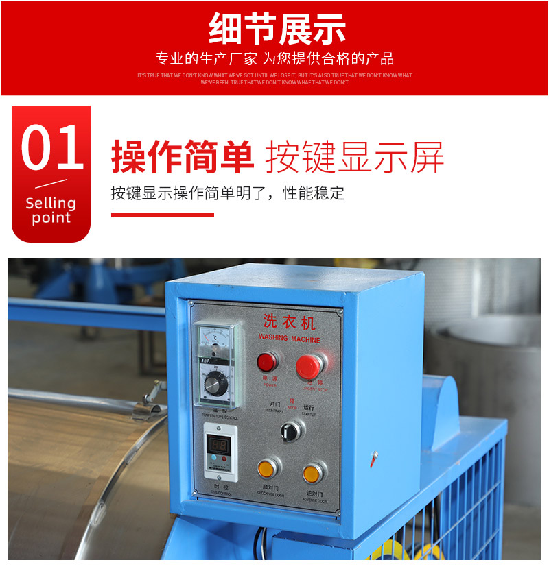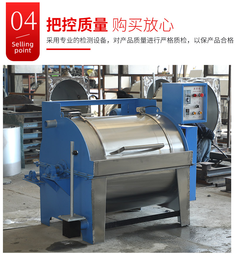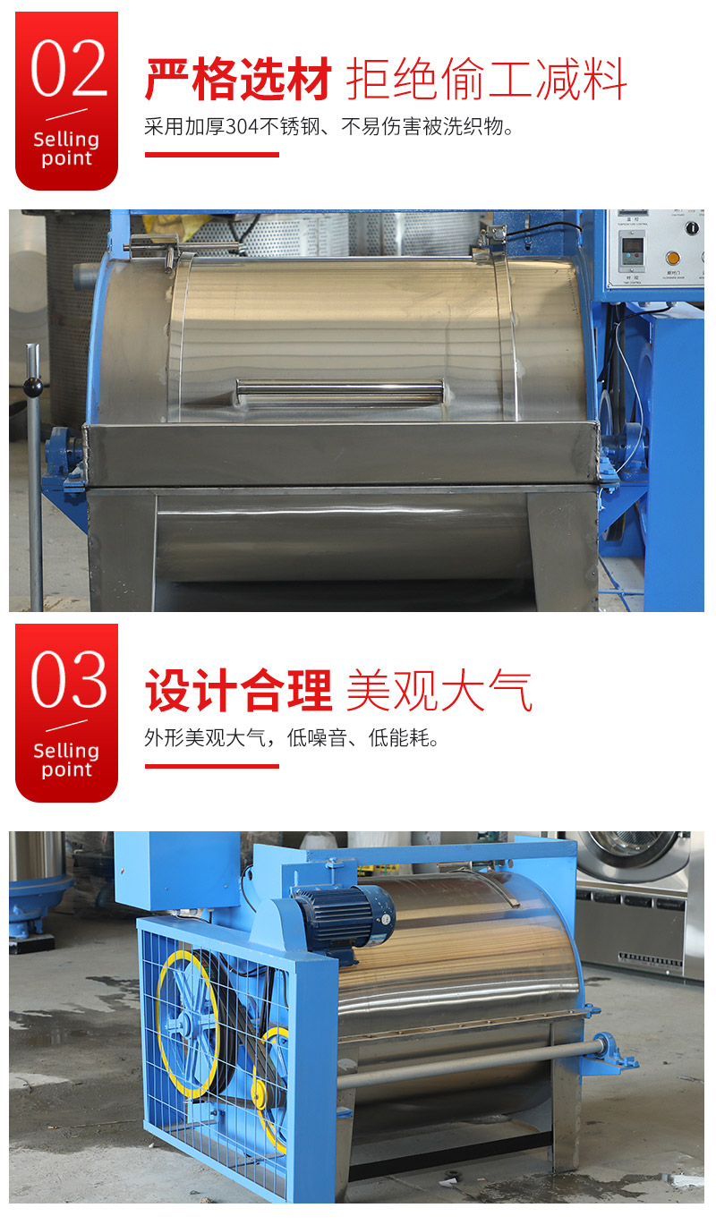 ● 工业洗衣机具有结构紧凑,操作维修方便、设计合理,运转平稳,使用寿命长等特点。其主要部件、内胆与外壳均用优质不锈钢精致而成。主要适用于服装水洗、面料洗涤,也用于棉、毛、化纤等织物的洗涤和漂染。是服装行业、宾馆、休闲、医院等工矿企业理想的洗涤设备。