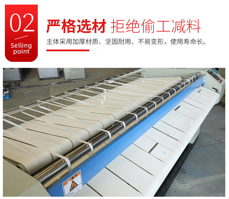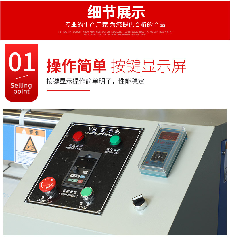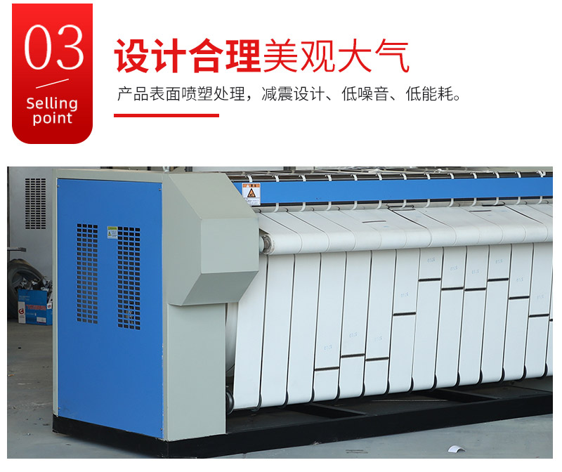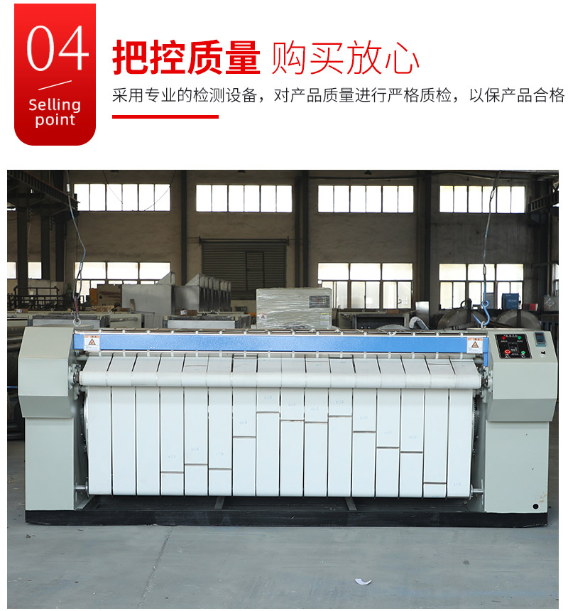 YP系列滚筒烫平机具有结构简便合理,熨烫幅度大,能耗低,性能安全可靠等优点。无级变速,用户可根据不同织物的需要及熨平状况选取适合的熨烫速度。物料输送系统采用优质定型宽锭带,避免了宽幅帆布在传送中难于解决的游动现象。烘筒采用优质不锈钢精致而成,具有加快、防腐蚀、织物易干易平等优点。有三种加热方式可选:蒸汽加热、电加热、燃气加热。