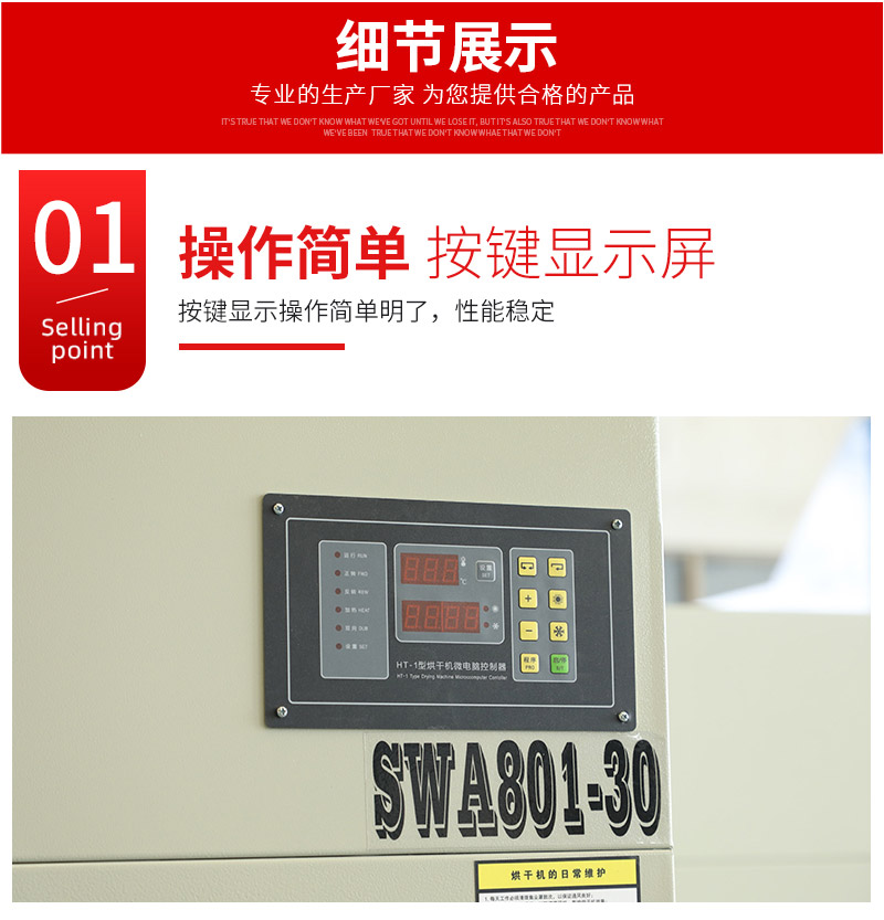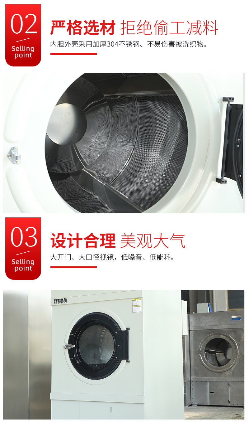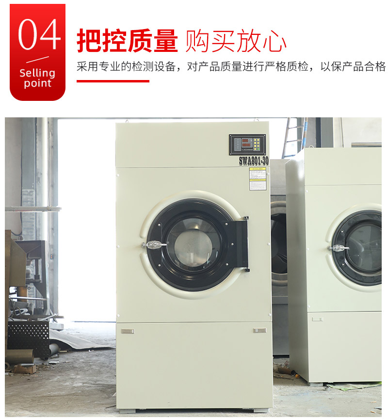 ● 全自动烘干机具有热效率高,使用方便,采用大功率加热器,热交换快,热能利用率高。采用大直径门,装卸衣物方便。● 大面积毛绒收集网,防积尘网机,不容易造成毛绒堵塞,保证了风道通畅。内胆采用优良不锈钢,结实耐用,衣物磨损少,豪华不锈钢面板,使设备的外型美观豪华,全电脑控制,可精确设定烘干时间和烘干温度,电脑板采用轻触式按键设计操作灵活。